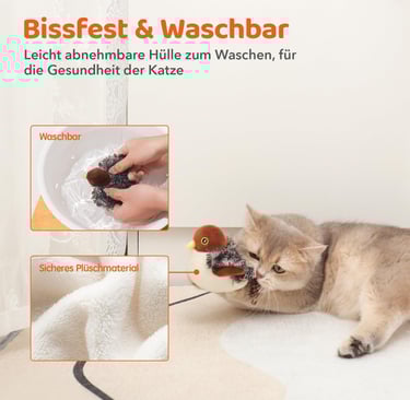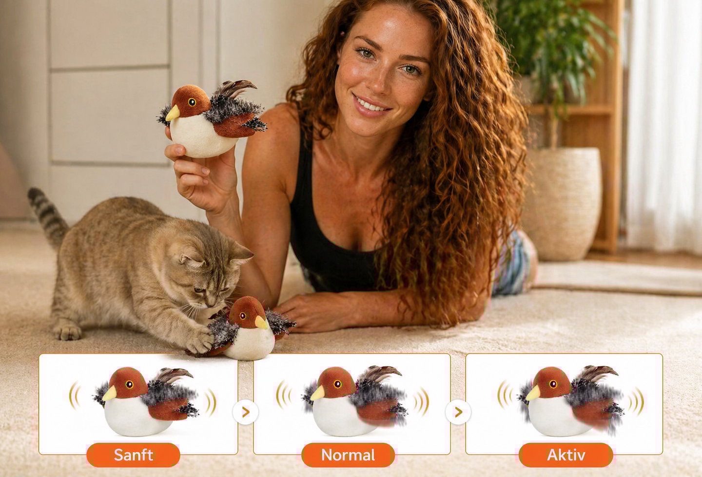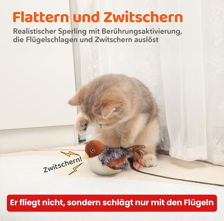 Dieses Spielzeug ist kein gewöhnliches Stofftier. Es ist ein intelligentes, berührungsaktiviertes Tool, das erst zum Leben erwacht, wenn deine Katze es berührt. Dank des eingebauten Bewegungssensors flattert der Spatz wie ein echter Vogel – das weckt sofort den natürlichen Jagdinstinkt, ohne dass du selbst den Spielstab schwingen musst.